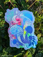 My hand drawn, linocut style design features a cluster of Funeral Bell mushrooms in different stages of fruiting amongst scattered stars and a crescent moon. I’ve paired them with the jagged foliage of one of my favorite native plants, the Trumpet Vine (Campsis radicans).