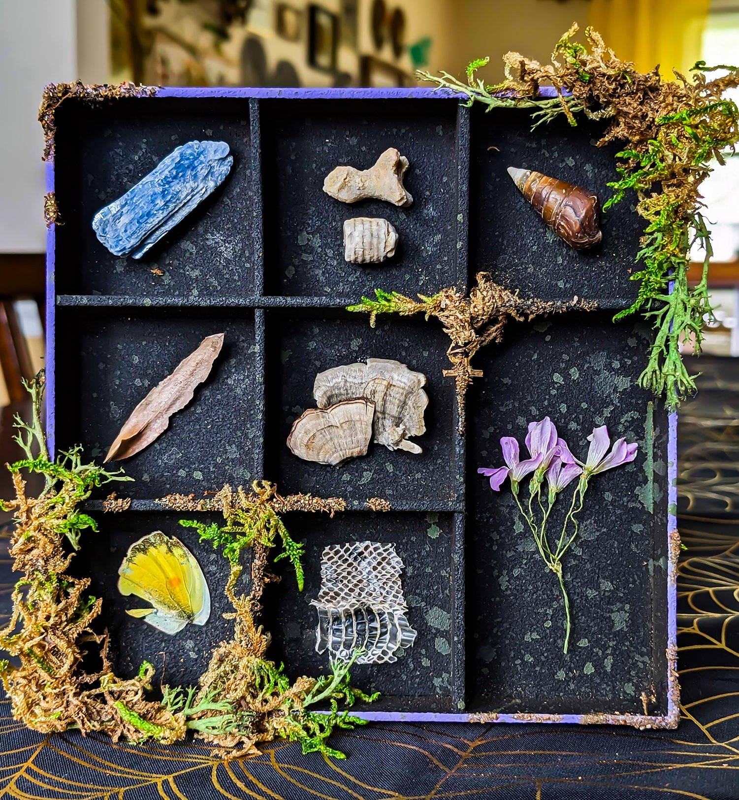 The curiosities included in this box are (top row) Blue Kyanite from a local gem shop, fossilized coral and crinoid stems from local private property, a river snail shell, (middle row and large compartment) tulip poplar samara, turkey tail mushroom, and preserved giant wood sorrel bloom, (bottom row) Colias philodice (Clouded Sulphur) butterfly hind wing, and a piece of shed skin from my beloved Western Hognose snake, Seymour.