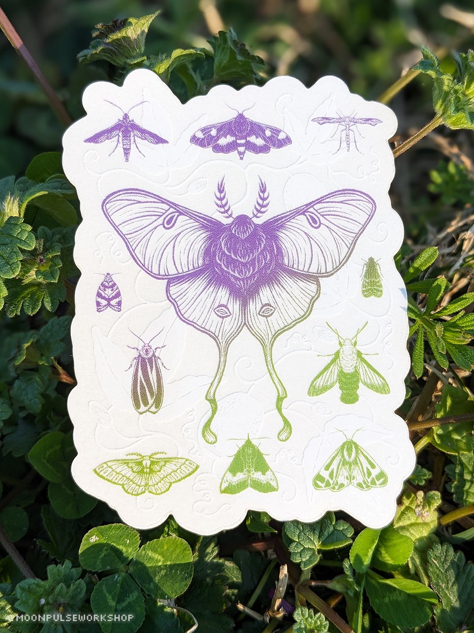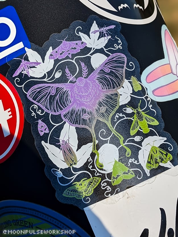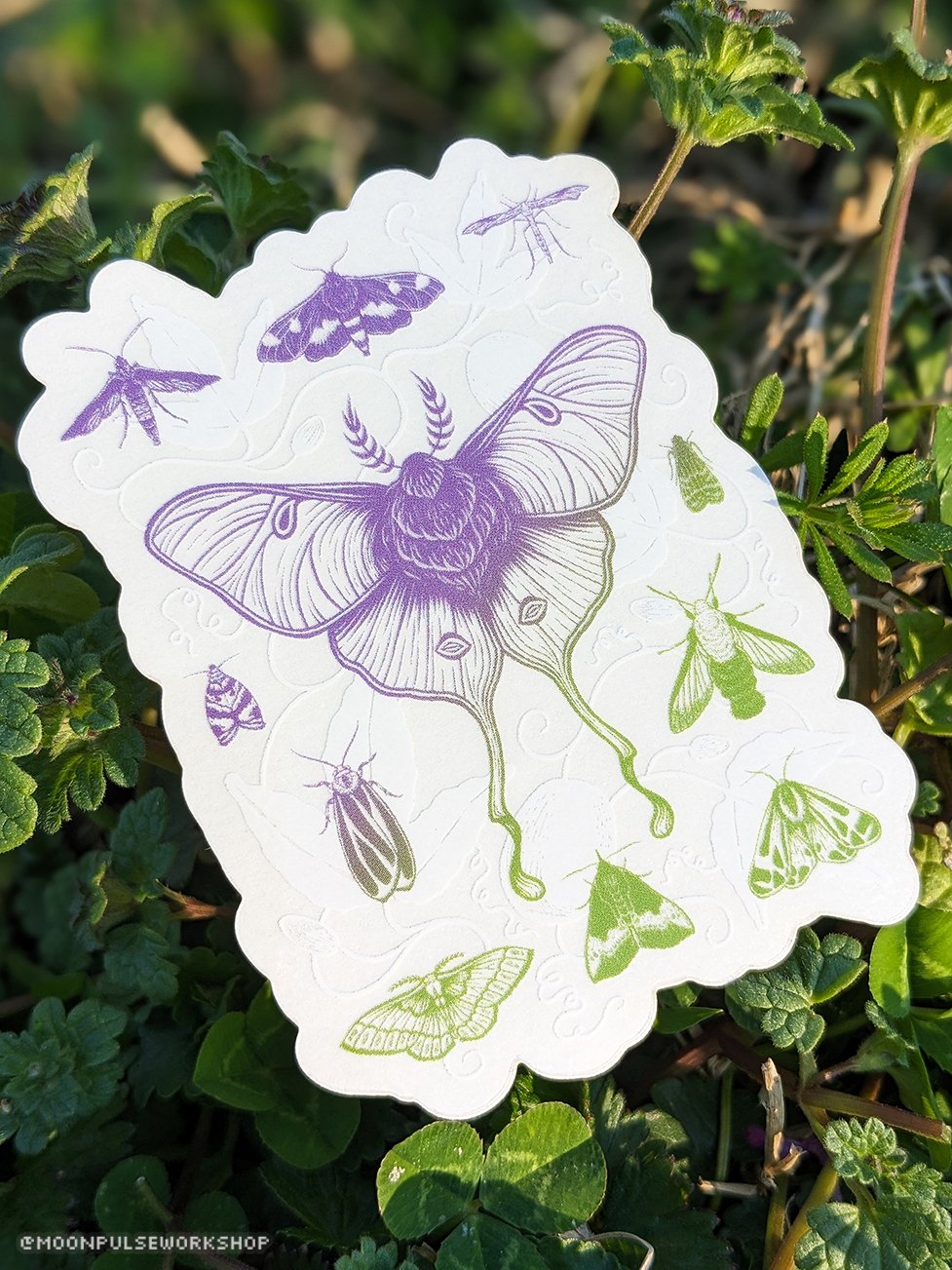 My hand drawn, linocut style design features eleven different species of Southeastern North American native moths on a background of Passiflora incarnata vines, foliage, and fruit (purple passionflower or Maypop).